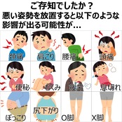 ・【ご存知でしたか?】悪い姿勢を放置すると、『首のこり』『肩こり』『腰痛』『頭痛』『便秘』『むくみ』『疲れやすい』『息切れ』『ぽっこりお腹』『垂れ尻』『O脚』『X脚』などの影響がでてしまう可能性が…。